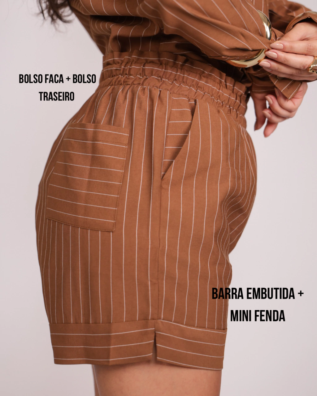 O short SLASH é uma peça extremamente atemporal e versátil. O tecido é viscose em risca de giz, um clássico mas moderno. É com o corte estilo pijama: cós de elástico e pernas retas. Tem bolsos faca frontais e bolsos traseiros, alem da barra embutida com uma mini fenda lateral
